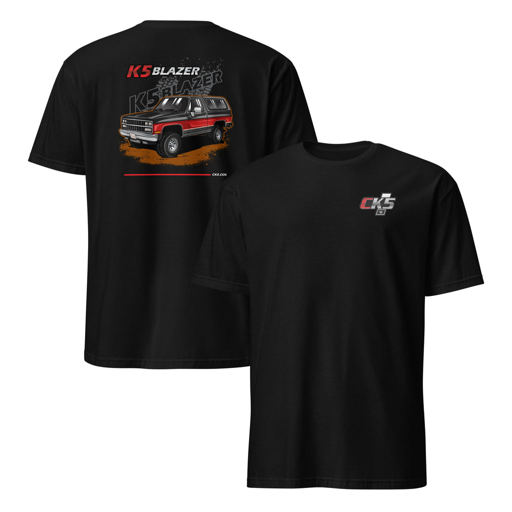Show off your love for the mighty Chevy K5 Blazer with this killer T-Shirt featuring a lifted 1989-1991 Silverado 4x4 Chevy Blazer.